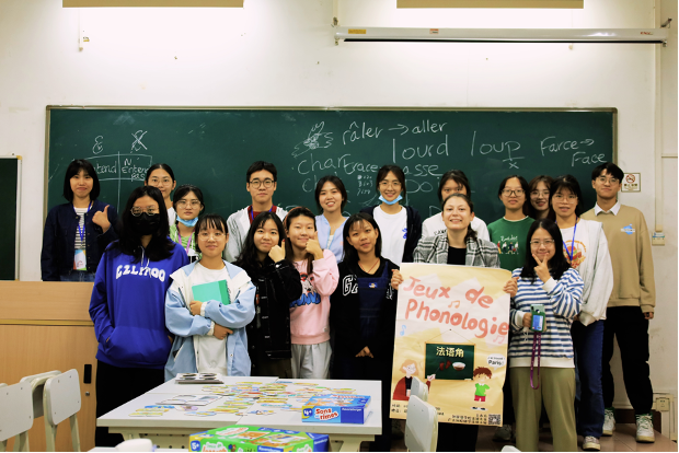 本次活动聚焦法语音素的发音与辨识,由外教Anne-Flore Vrac老师组织,以趣味游戏形式展开。首先,老师带领全班同学通过语音游戏一起听音辨音;之后,同学分组进行字母游戏;最后,老师指导同学一起纠正字母游戏中出现的单词发音错误。