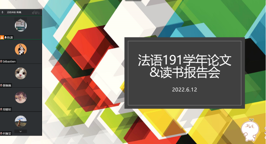 6月12日上午九点,法语专业19级本科生学年论文线上报告会顺利开展(腾讯会议号:229132626)。此次会议由西语系主任邹琰副教授主持,外教Frédéric Girani、Sébastien Damry和Anne-Flore Vrac,以及陈潇、冯雪飞、李悦和卢秋燕老师参加了会议。