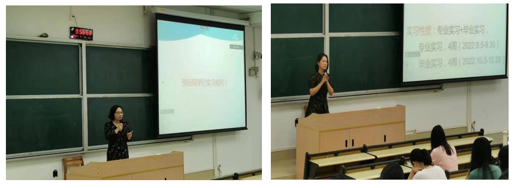 曾超老师就见习周的活动做了安排,并集中回答了学生们提问最多的实习岗位、实习纪律、实习成绩等相关政策和问题。温静老师对下学期将要开展的实习工作做了安排,详细讲解了实习材料、学校的防疫政策与实习打卡等方面的要求。