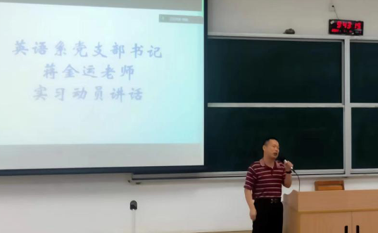 英语系党支部书记蒋金运老师代表英语系领导发言,鼓励学生积极参与实习活动,为将来的学业、就业做好准备。