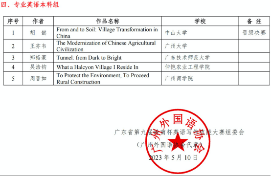 5月10日,2023年岭南杯“美丽乡村,希望田野”大学生英语写作技能大赛的“金笔奖”获得者水落石出。
