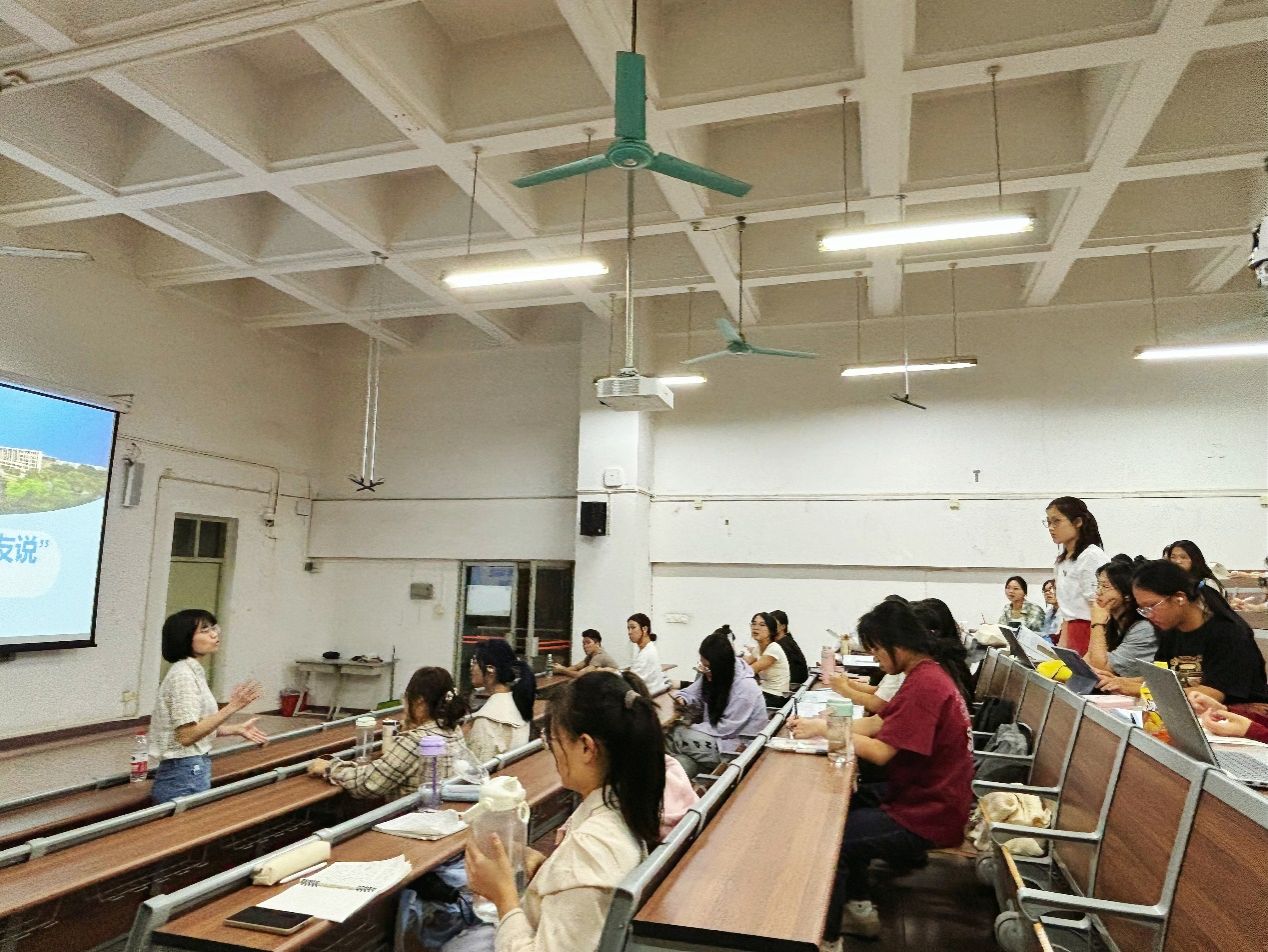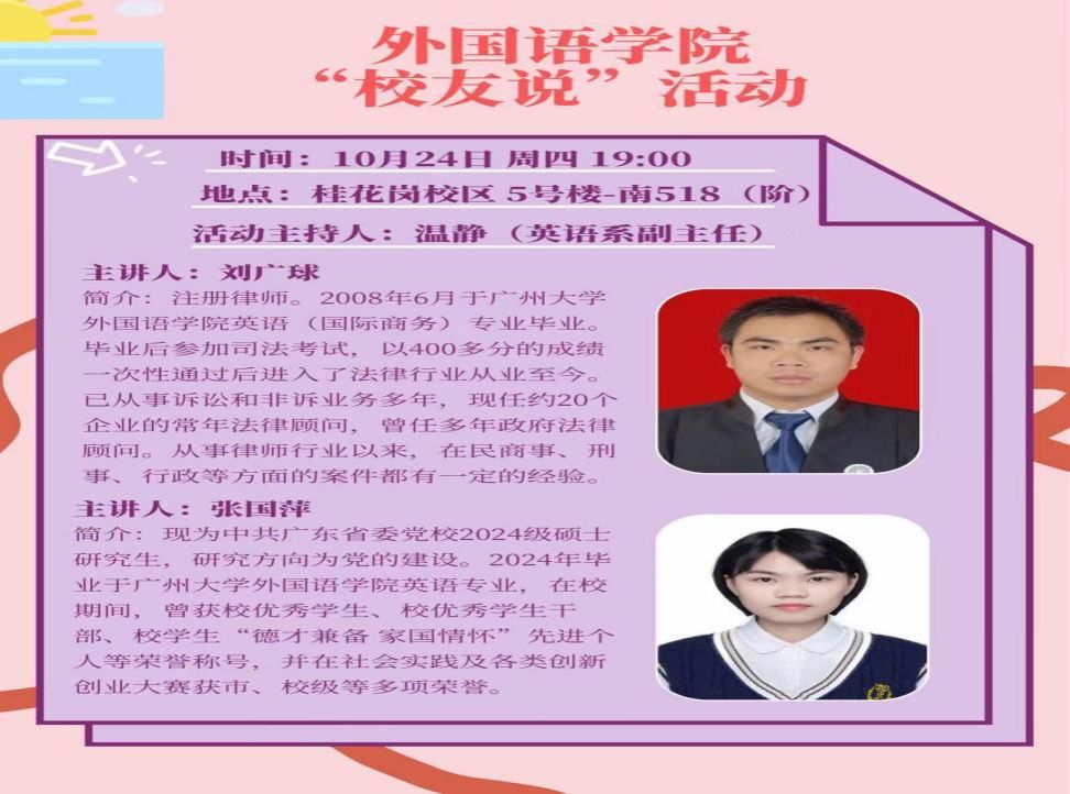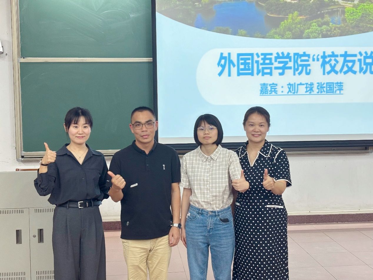 近期开展的系列“校友说”活动中,英语专业两位优秀校友----刘广球和张国萍回到桂花岗校区,在5号楼南518室为100多位英语专业新生进行讲座,英语系副主任温静老师主持了该活动,金荣老师作为活动嘉宾参与到了讲座现场。
