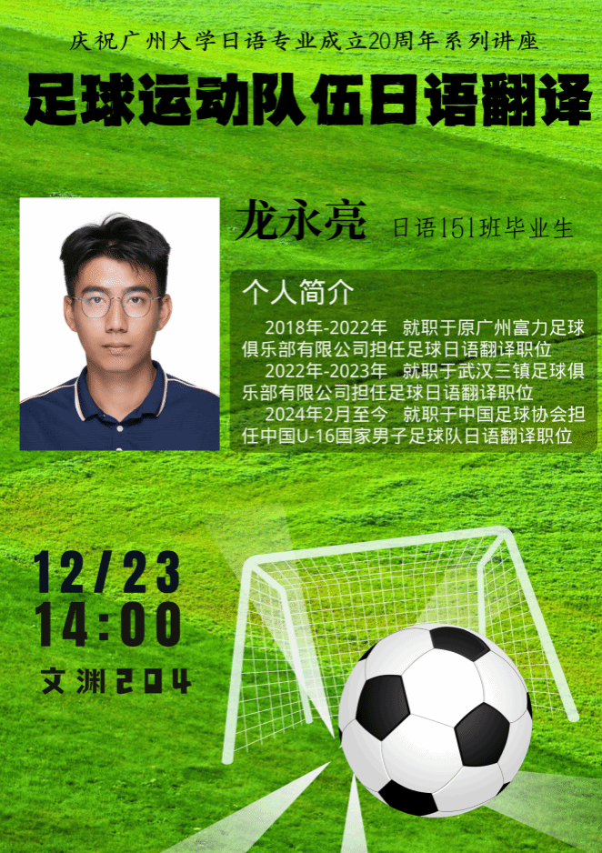 作为系列活动之一,东语系邀请2015级毕业生、现任中国U-16国家男子足球队日语翻译龙永亮做题为“运动队(足球)日语翻译经验分享”的讲座,本次讲座由欧丽贤老师主持。