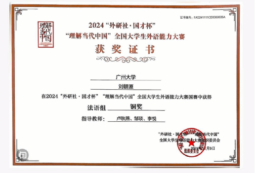 刘朝源同学在比赛中展现了扎实的法语功底。他以流畅的法语表达对“理解当代中国”的独到理解,赢得了评委的高度评价,最终在众多选手中脱颖而出,荣获铜奖。