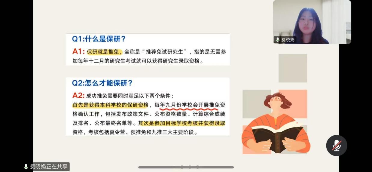 一等奖学金,并在 CATTl 杯日语笔译复赛中斩获三等奖等多项荣誉。现已保送进入深圳大学日语语言文学专业攻读硕士学位的她,在分享会上重点解答了两个保研相关问题:一是详细解释了保研即 “推荐免试研究生”,学生无需参加十二月的研究生考试便可获取录取资格;二是说明成功保研需满足获得本科学校保研资格(每年九月学校开展相关工作)以及通过目标学校考核(含夏令营、预推免、九推阶段)等条件。