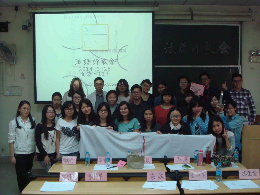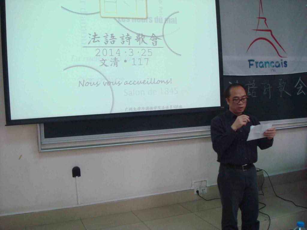 西语系首届法语诗歌会在文清楼117室隆重举行。学院党委周海兵书记、副院长覃鸿怀副教授、法语131班主任邹琰老师等莅临出席。朗诵会上,以法语系为主、英语系和日语系同学都上演了精彩节目。法语131的苏泳豪等六位同学分获奖项。