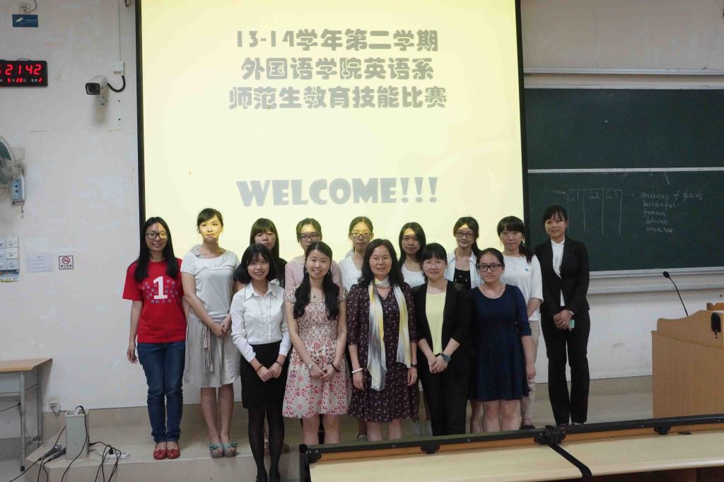 英语系教育教研室和团委学生会主办的13-14学年第二学期英语系师范生教育技能大赛在于文新106成功举行。副院长覃鸿怀以及陈姝、陈丽虹等老师莅临了比赛现场并担任评委。