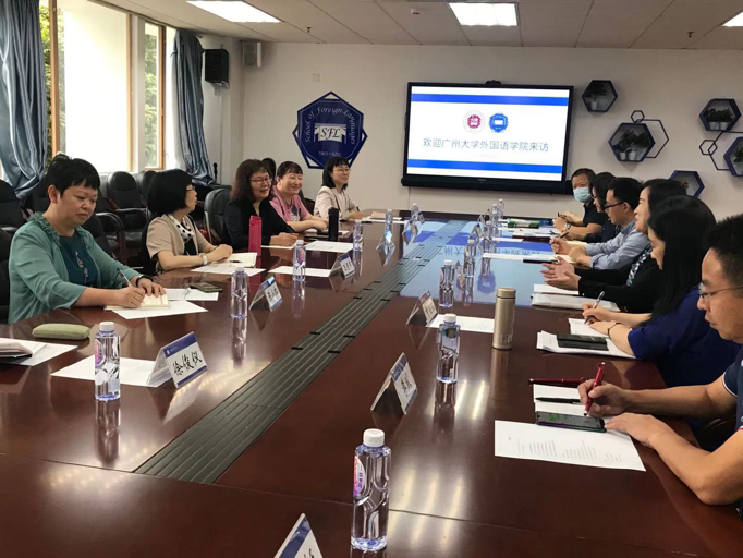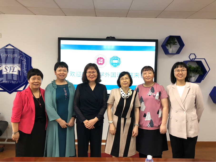 老师的到来表示热烈欢迎。李小均副院长介绍了深大外院的发展历程,研究生招生与培养经验,提出了目前研究生培养存在的一些困惑。院长助理金娜娜老师介绍了海外研究生培养方式,为我们创办国际化人才培养基地提供了有益参考。随后,贾陆依副院长介绍了本科人才培养模式,在课程架构、资源融合、特色创办方面与我们分享了许多宝贵经验。